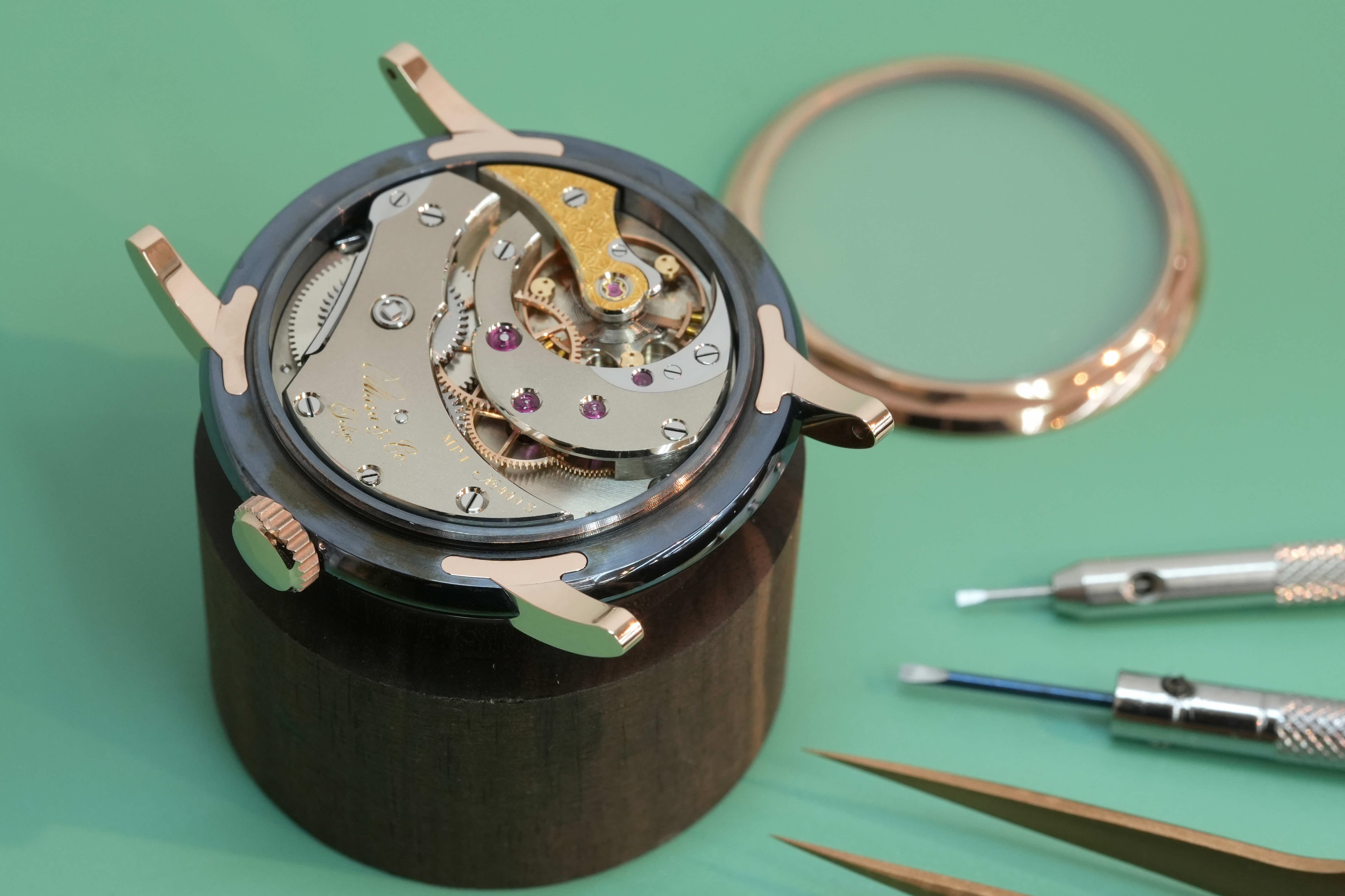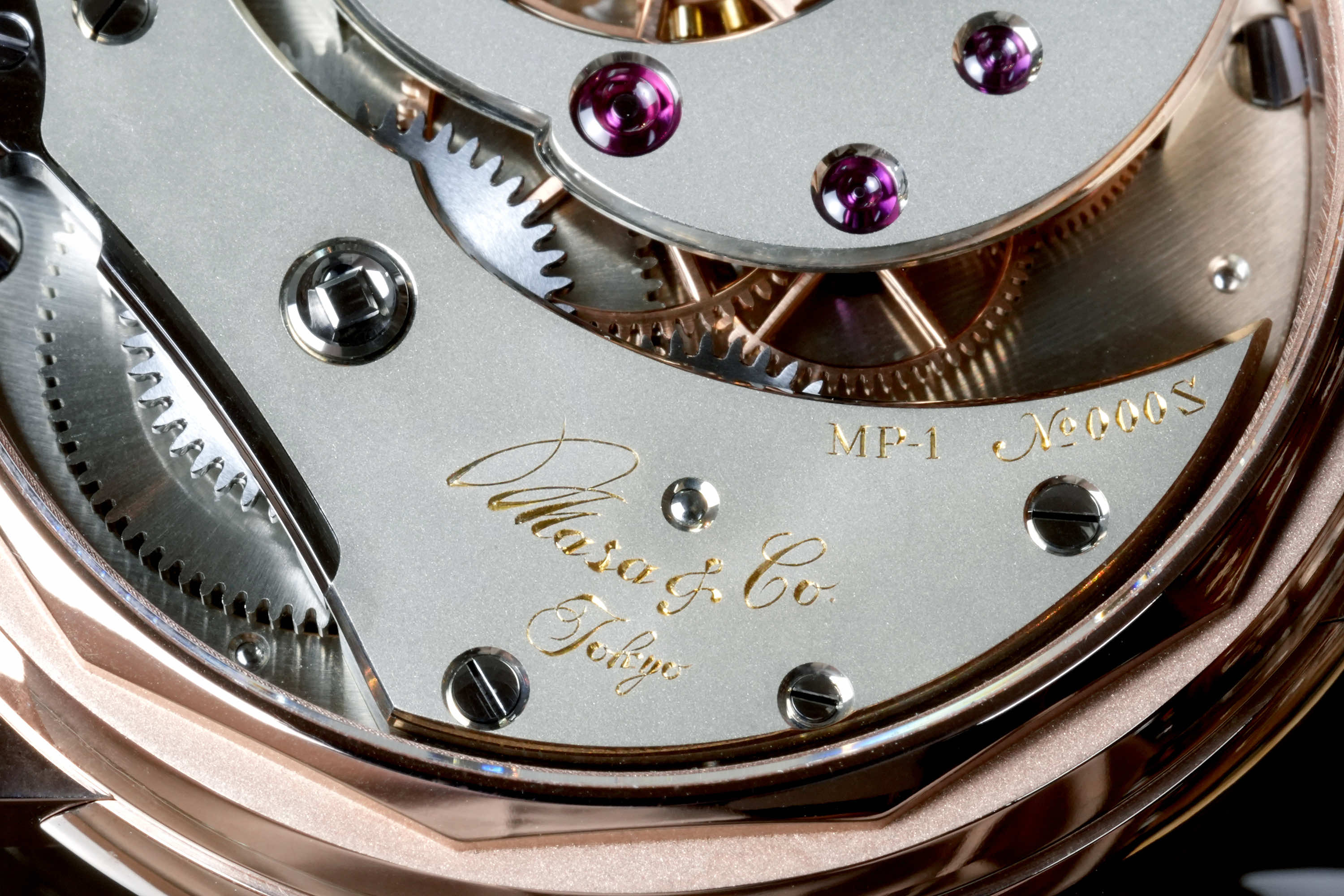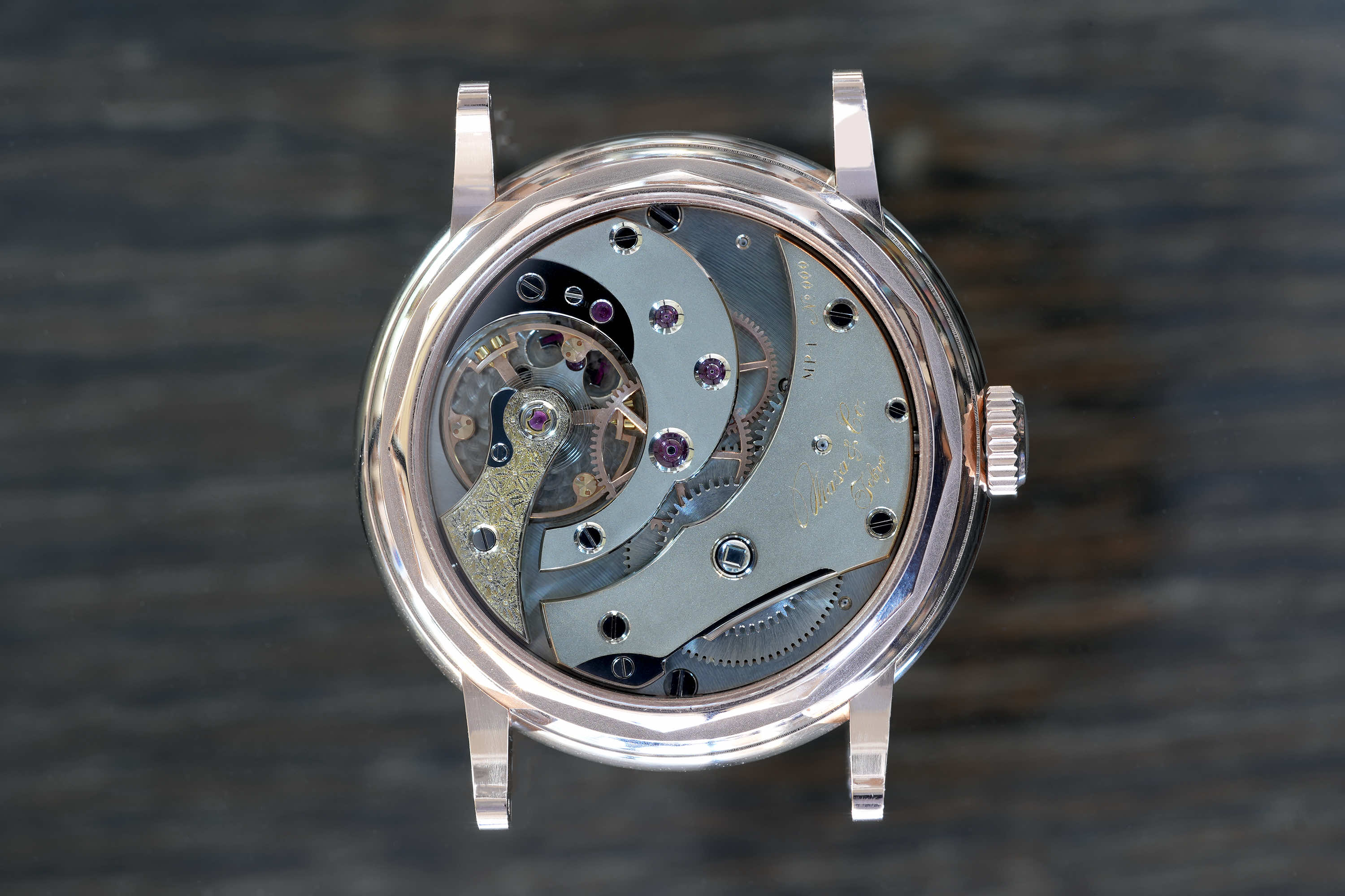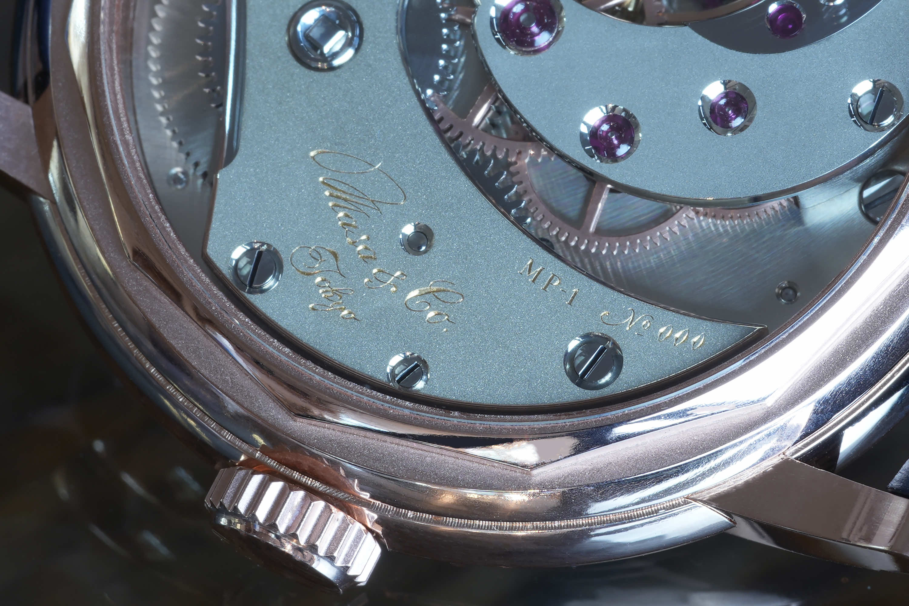 独自に仕上げられた自社製キャリバーMP1、専用設計のケースとの組み合わせにより「蒼黒」が完成した。