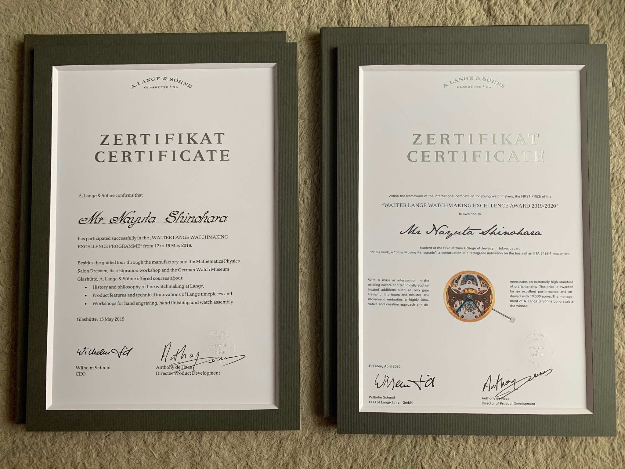 同校在学中の2020年、日本人として初めて「WALTER LANGE WATCHMAKING EXCELLENCE AWARD 2020」において金賞を受賞し、
